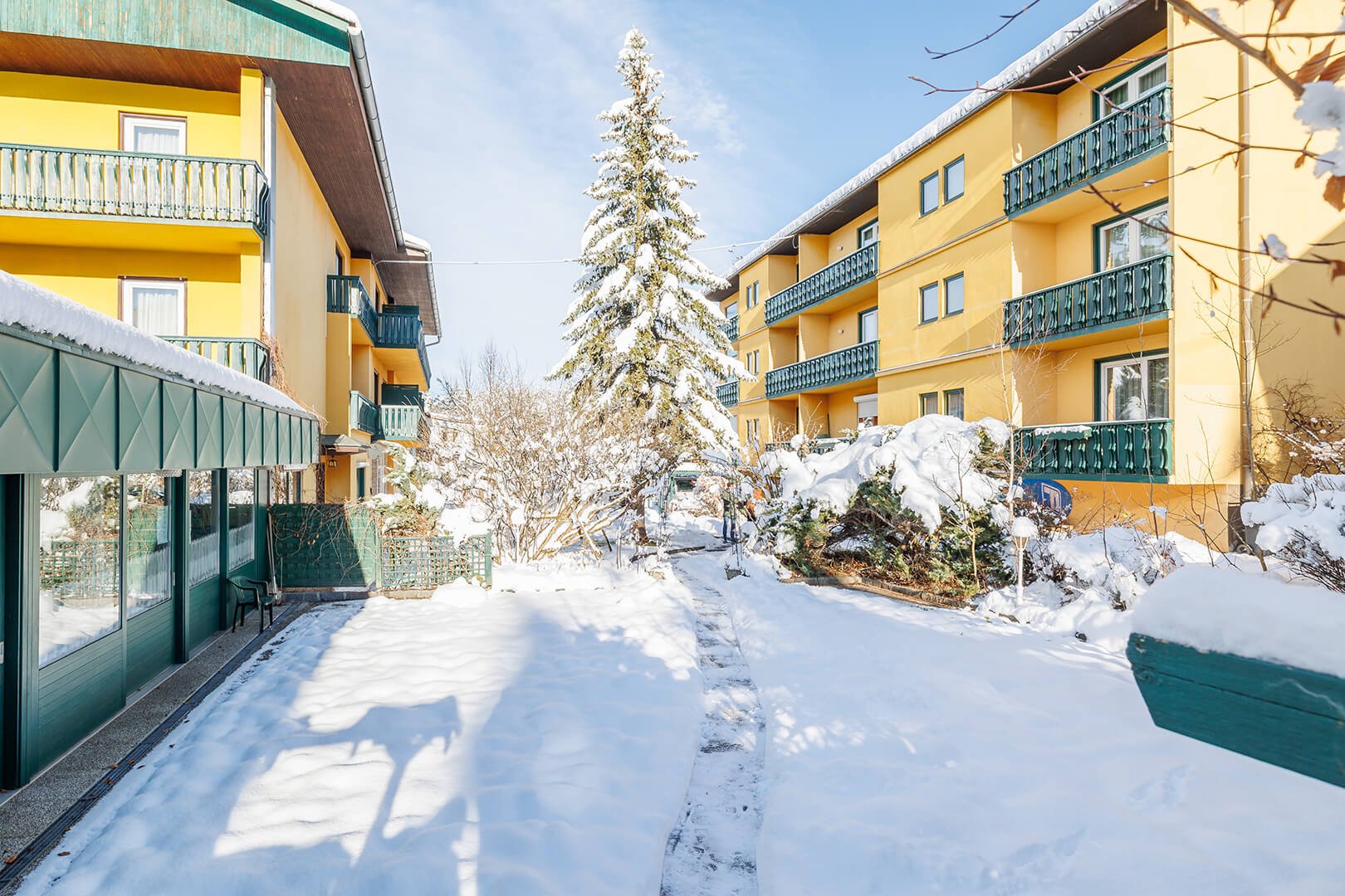aufgeteilt auf zwei Hotelgebäude