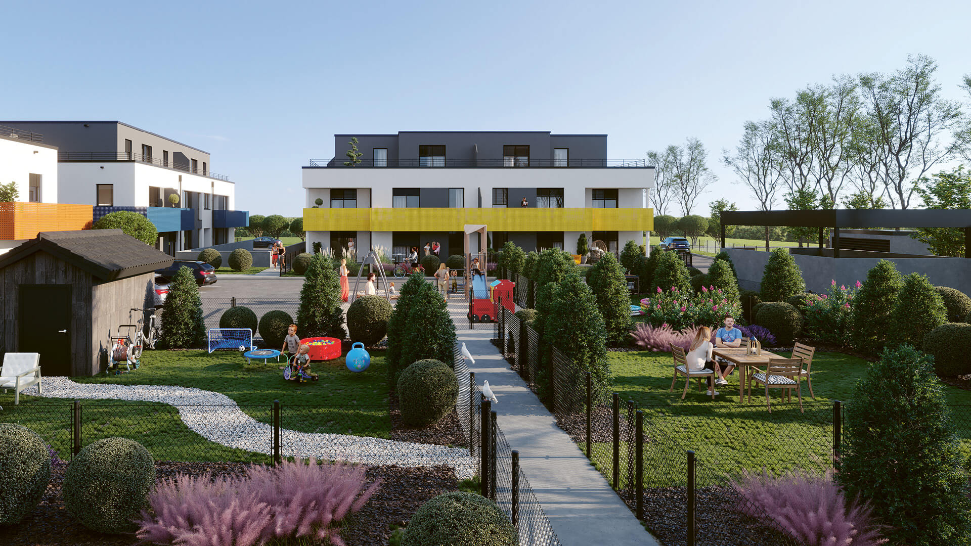 Nachhaltig gebaut  /  Photovoltaik  /  Tiefgarage  /  E-Ladestationen  /  Moderne Ausstattung  /  Große Balkone & Terrassen  /  Energieeffizienz  /  Eigengärten oder eigene Schrebergärten